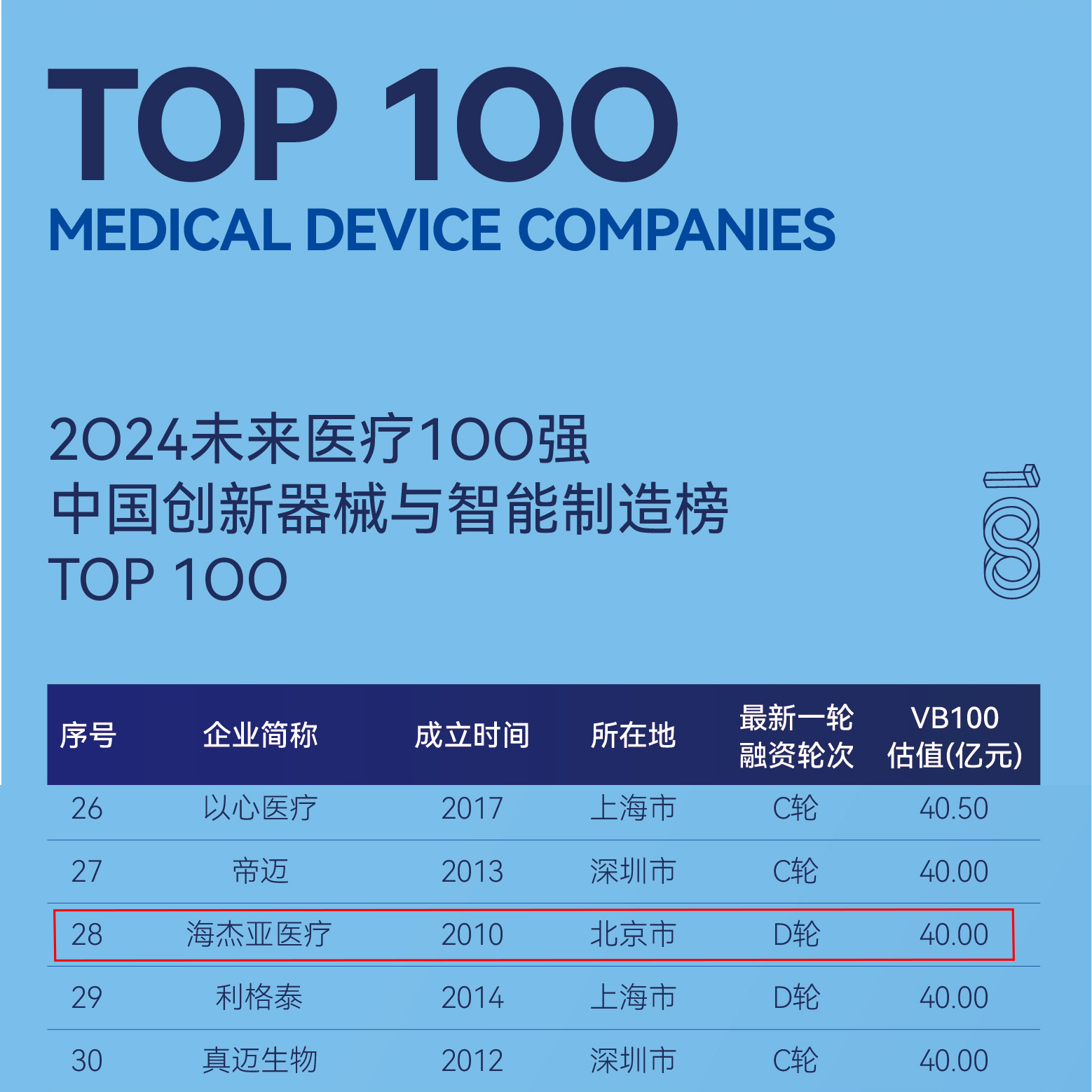 2024年5月9日,第八届未来医疗100强榜单发布,海杰亚医疗再次入选2024未来医疗100强主榜中国创新器械与智能制造榜TOP100,同时,康博刀®「易」系列复合式冷热消融系统入选VBEF医疗健康产业创新力产品榜。